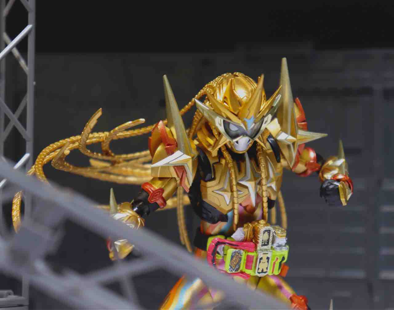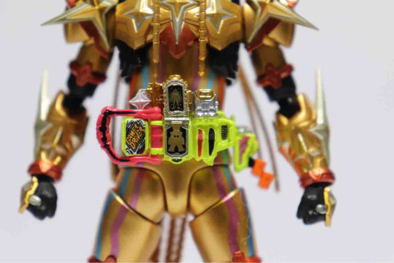これまた鎧武のカチドキから極と同じように、1個前の重厚な形態の変身アイテムに、最強形態の変身アイテムをセットすることで変身。そのためドライバーが滅茶苦茶重くなり派手になります。
